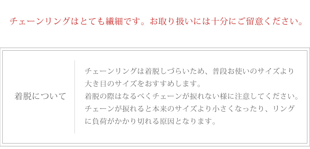 チェーンリングはより少し(2-3号)大きめのサイズだと着脱がしやすくなります。 着脱の際はチェーンがねじれないようにご注意ください。