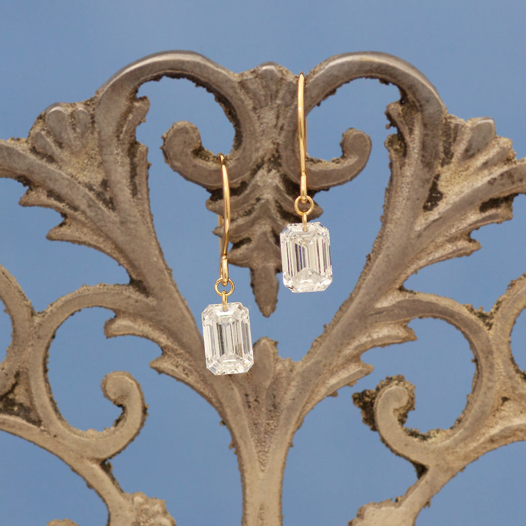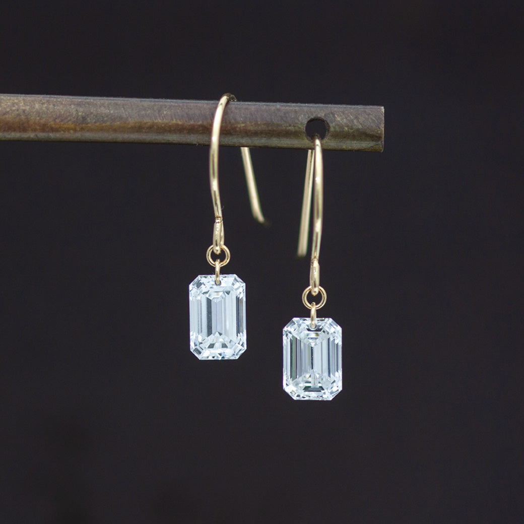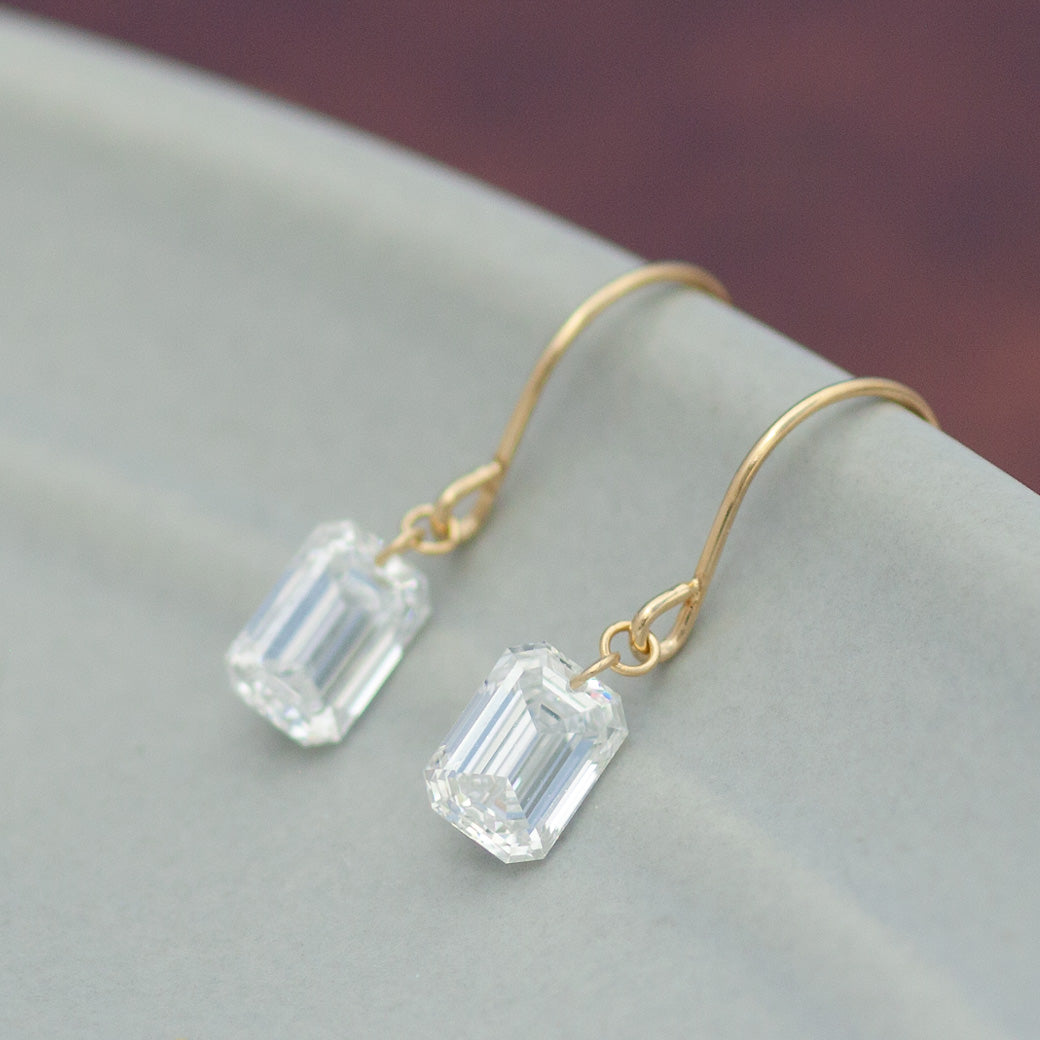 氷のようなキリっとシャープな輝きが特徴のエメラルドカット。片耳0.5ctの大粒ダイヤモンドが耳元でシャープに輝きます。