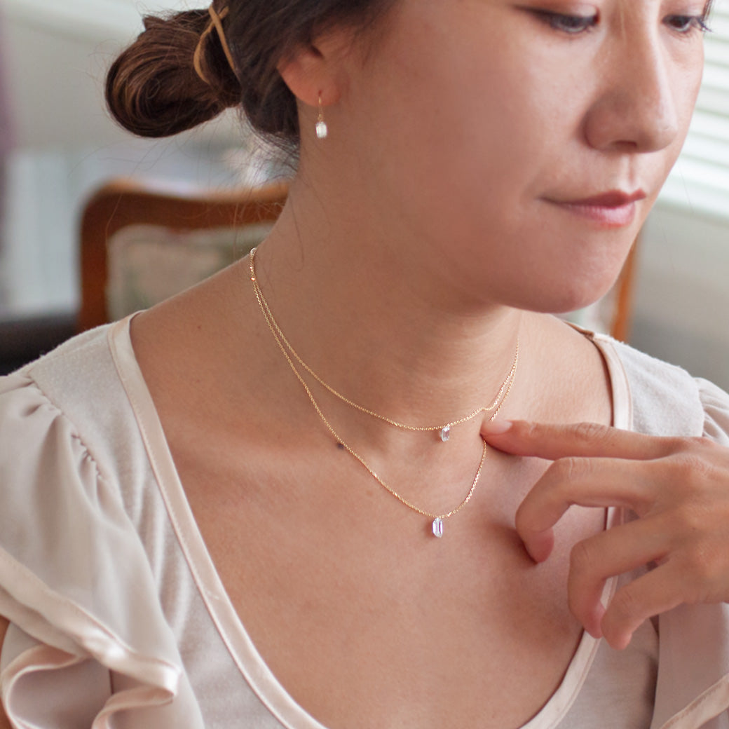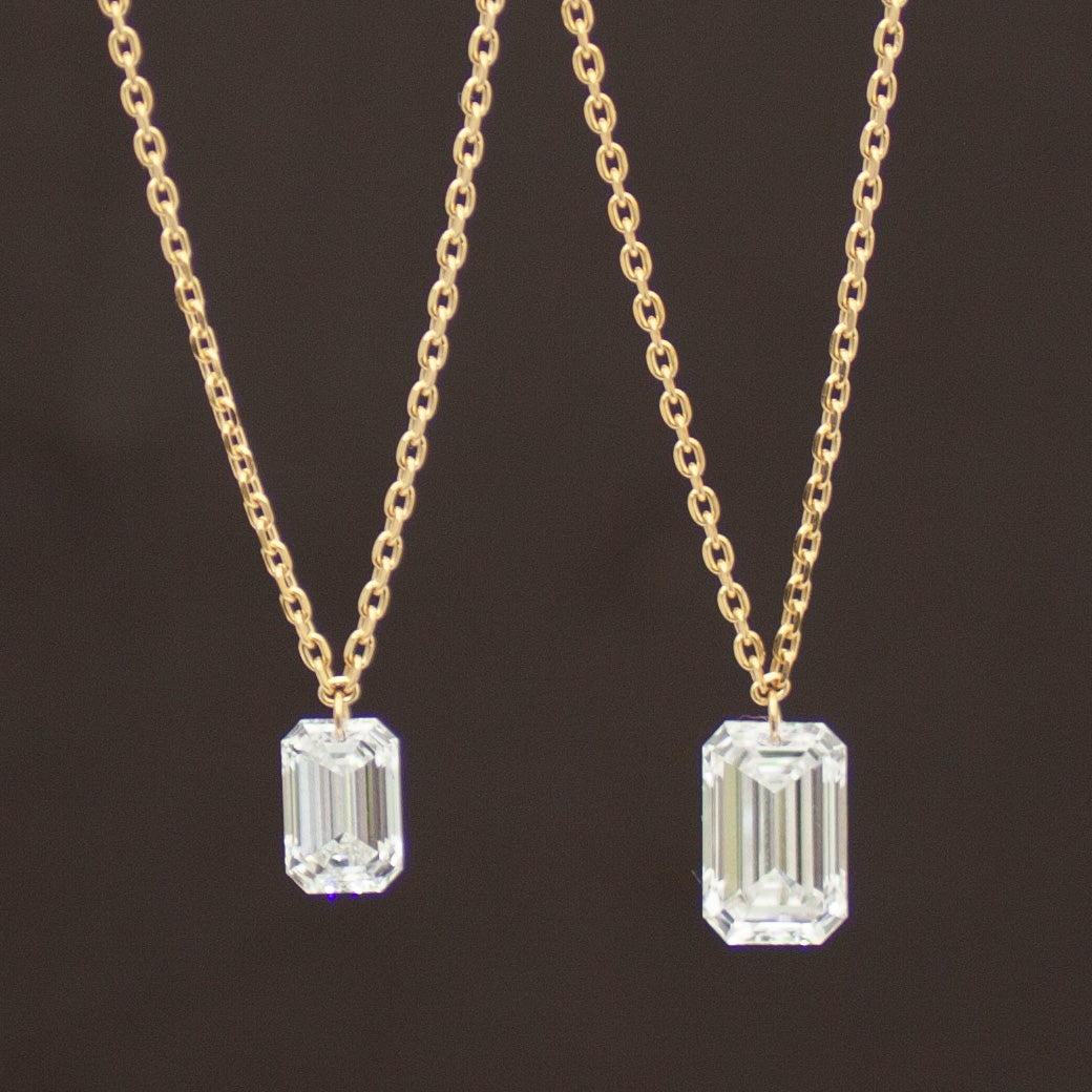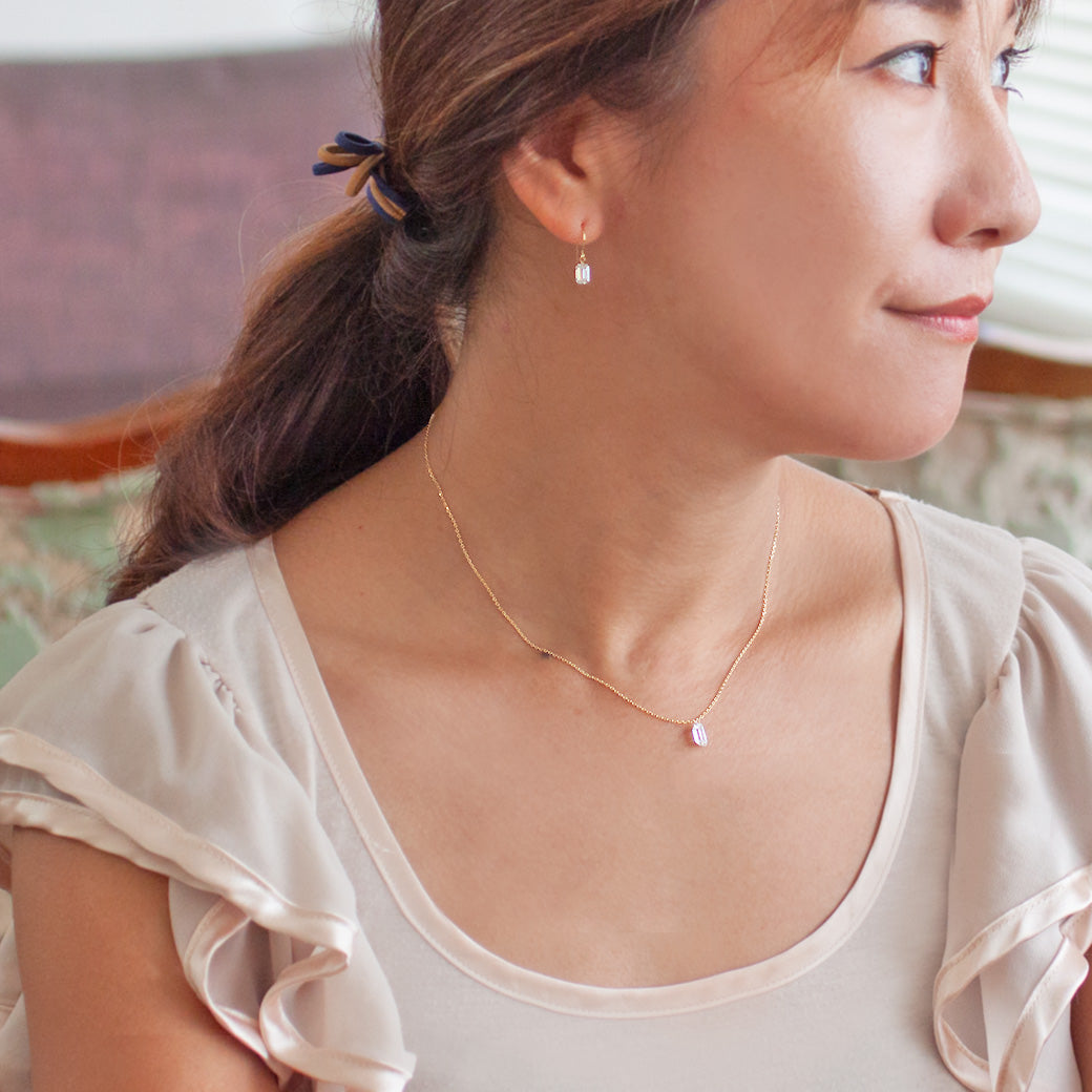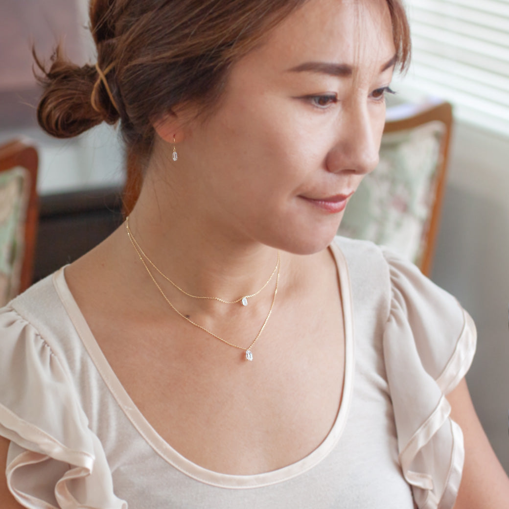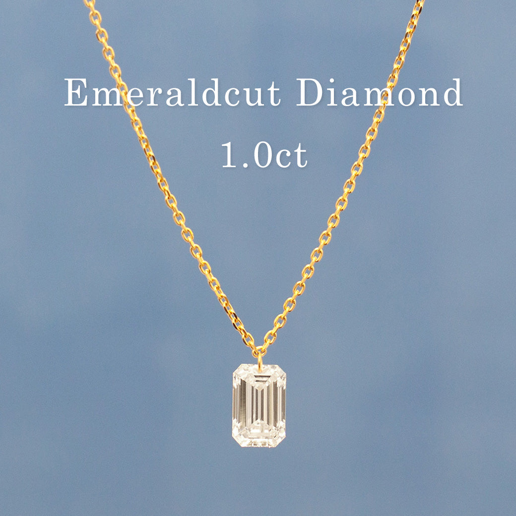 シャープで洗練された印象のエメラルドカットをひと粒、シンプルだからこそ美しいネックレス。