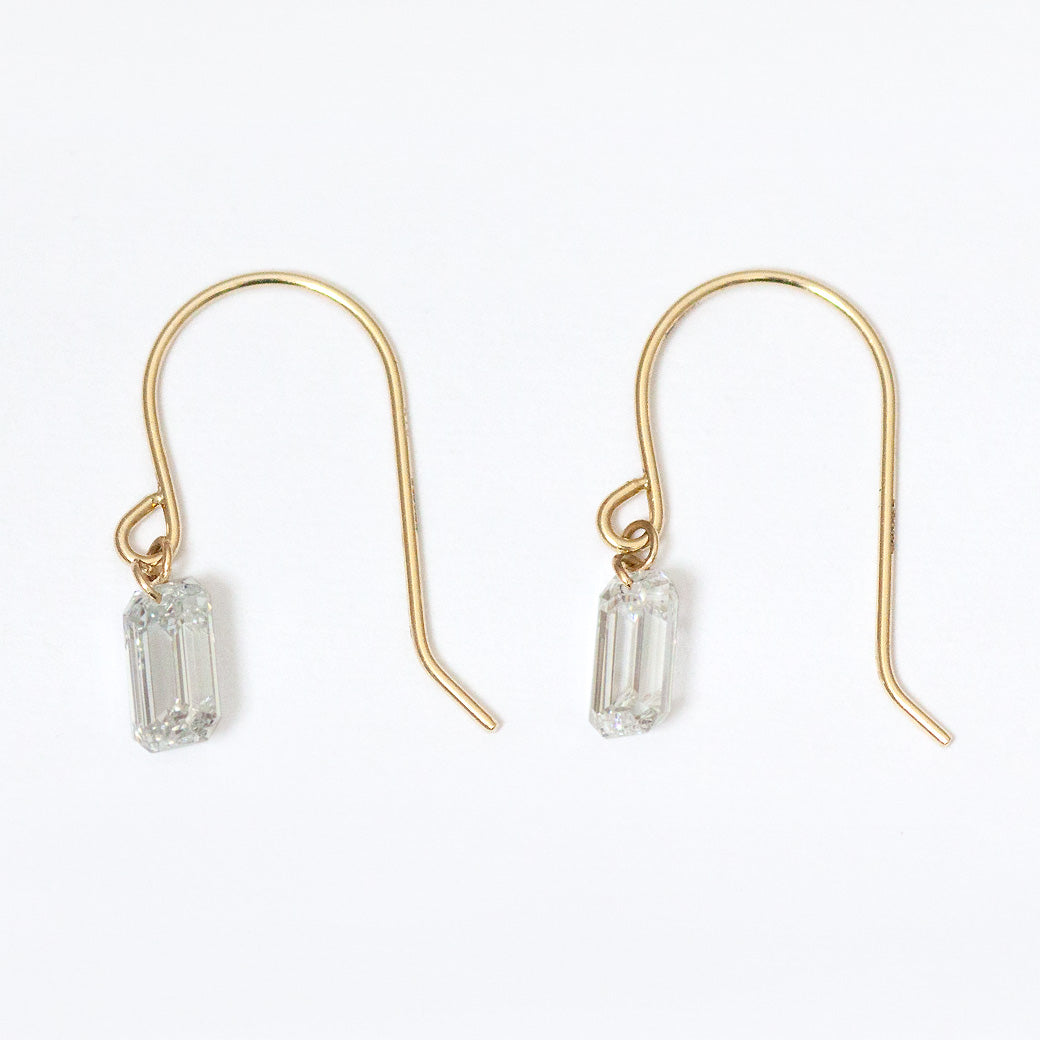 シャープで落ち着いた印象のエメラルドカットダイヤが放つ輝きが、耳からこぼれ落ちるような繊細な美しさ。